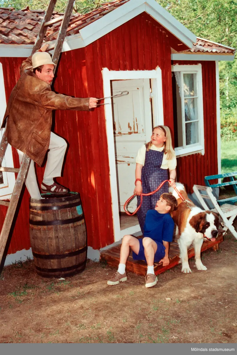 Sommarspelen/barnteaterföreställningen "Tjorven på Saltkråkan" 1996 vid Byxorna i Gunneboskogen. Pappan i familjen (Per Andersson) står på en stege och pekar med en grilltång. Två barn befinner sig vid entrén till ett rött litet hus och flickan håller hunden "Båtsman" i koppel. Relaterade motiv: 2024_0525 - 0533.
