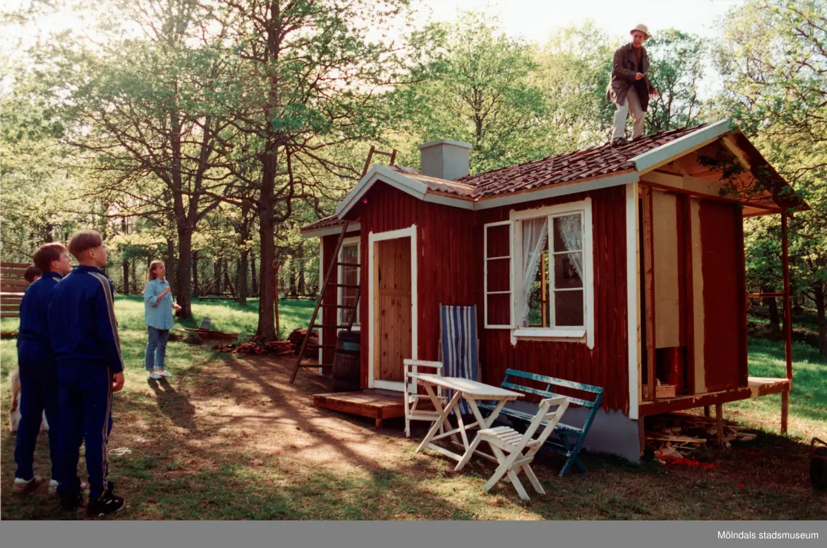 Sommarspelen/barnteaterföreställningen "Tjorven på Saltkråkan" 1996 vid Byxorna i Gunneboskogen. Troligtvis vid en repetition. Tre personer står och ser på när en man (Per Andersson) står på taket uppe på ett litet rött hus. Det lutar en stege mot taket. Omgivningen är fylld av grönska. Relaterade motiv: 2024_0525 - 0533.