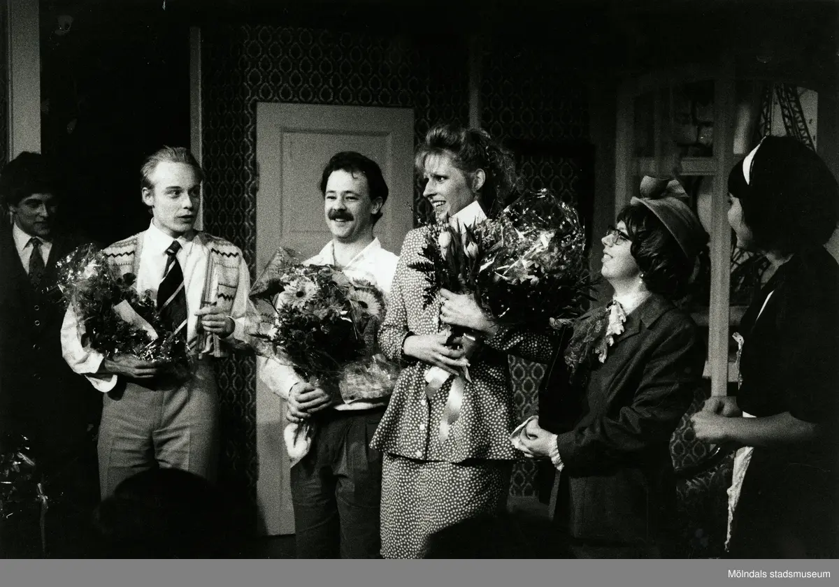 Teaterföreställning i Nya Teaterhuset, okänt årtal. Tre personer utav sex har mottagit blomsterbuketter.