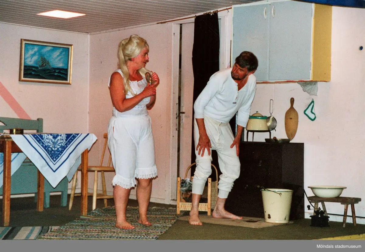 Föreställningen "Äggbekymmer & kontaktannons" i Teaterhuset 2001. En köksmiljö där en kvinna och en man står klädda i sina "gammaldags" underkläder.