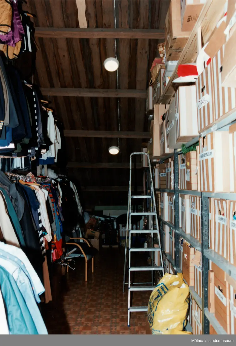 Ett förråd i nya Teaterhuset 1998. Till vänster ses flertalet teaterplagg som hänger i olika nivåer. Till höger ses hyllor innehållande kartonger av olika slag.