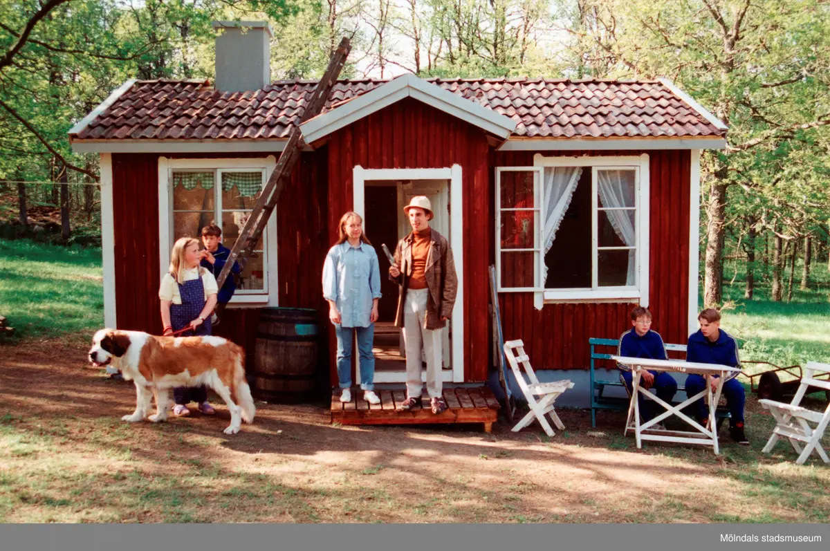 Sommarspelen/barnteaterföreställningen "Tjorven på Saltkråkan" 1996 vid Byxorna i Gunneboskogen. Troligtvis vid en repetition. Sex personer befinner sig vid en röd stuga. Från vänster står "Tjorven" med hunden "Båtsman" i koppel. Bakom henne står en pojke vid en stege. En kvinna och Per Andersson står vid entrén och till höger ses två pojkar som sitter i utemöbler. Omgivningen är fylld av grönska. Relaterade motiv: 2024_0525 - 0533.