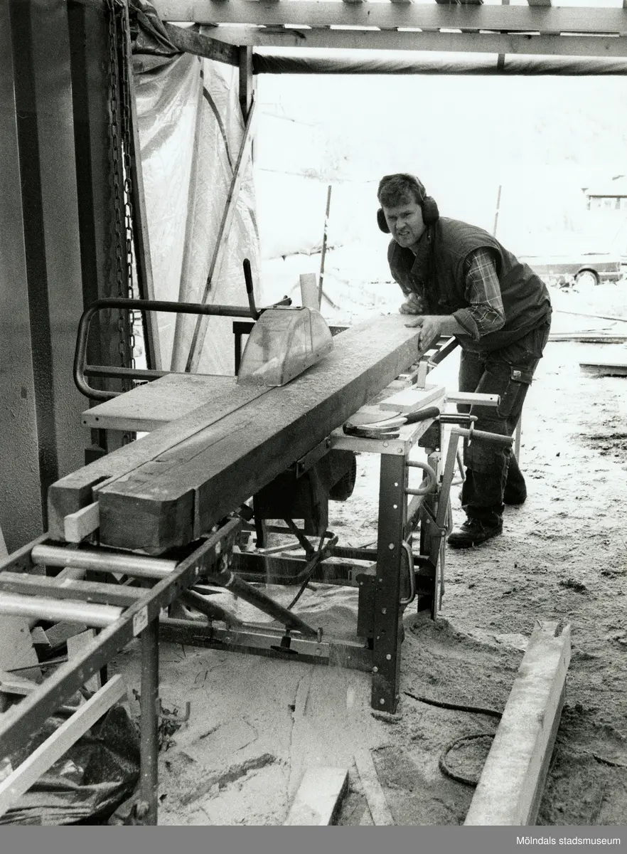 Nya Teaterhuset byggs upp 1997 - 1998. En person sågar i en stor träskiva som ligger på en sågbock. På golvet ligger det plankor i mindre storlekar. Mannen står delvis inomhus i någon typ av infart.
