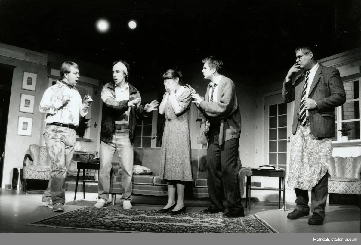 Teaterföreställning i Nya Teaterhuset, okänt årtal. Fem personer agerar på scenen i ett "vardagsrum". Andra person från vänster är Per Andersson.