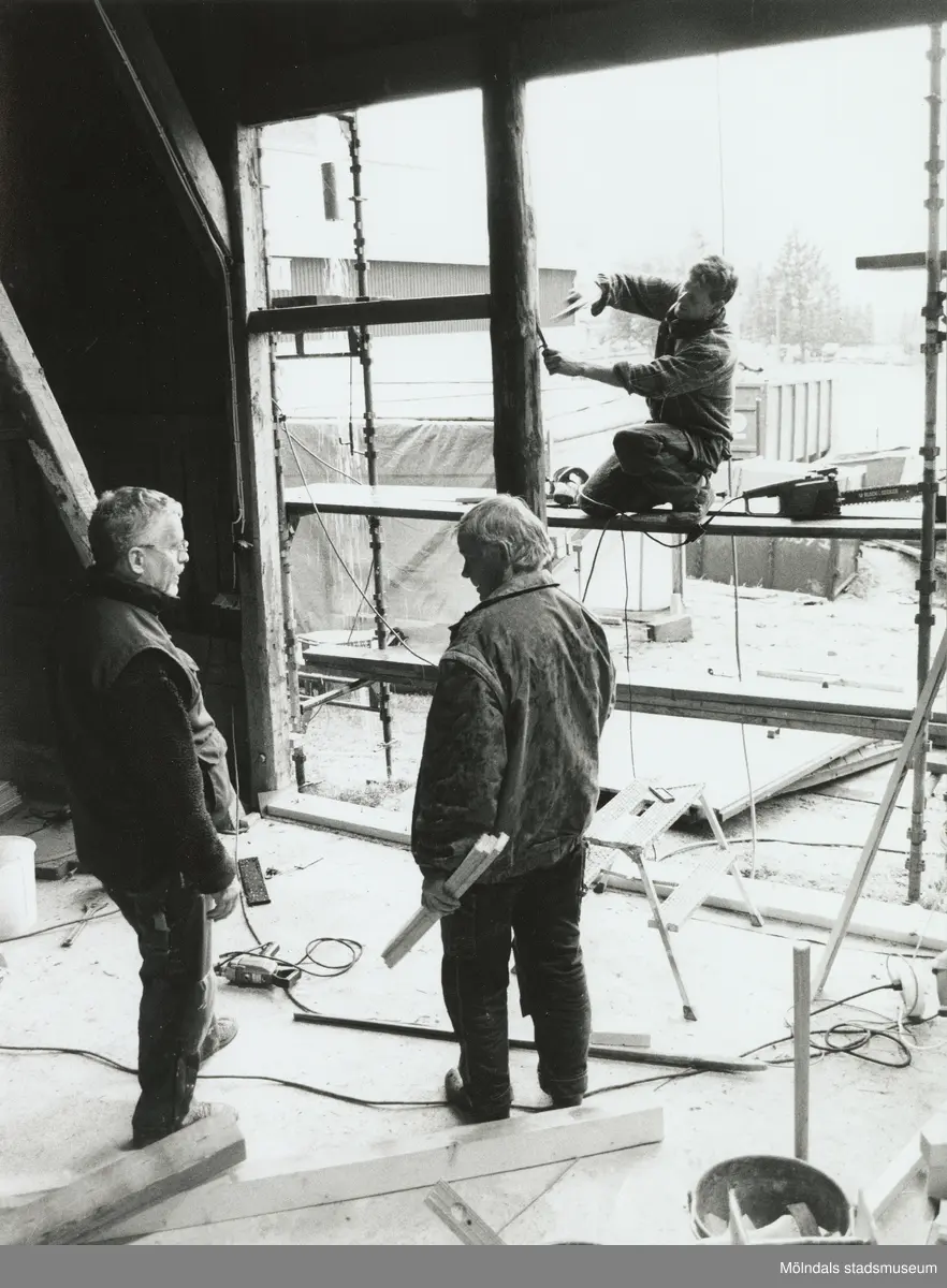 Nya Teaterhuset byggs upp 1997 - 1998. En person står utomhus på en byggnadsställning. Inne i lokalen står två män och ser på.