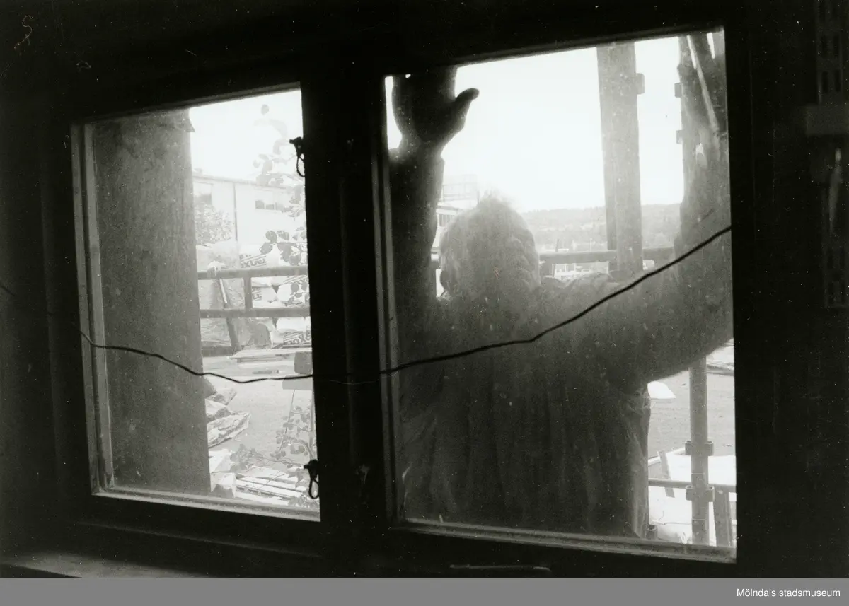 Nya Teaterhuset byggs upp 1997 - 1998. Bilden är tagen inomhus på ett fönster man ser ut genom. Utanför fönstret står en person med armarna upp över fönstret. Man ser även en arbetsställning som går runt ladan utanför fönstret, och längre bort ser man en annan byggnad sticka upp.