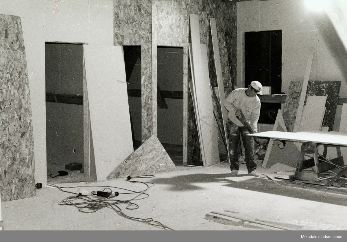 Nya Teaterhuset byggs upp 1997 - 1998. En bild inomhus på ett rum med träskivor som väggar. En person sågar i en stor träskiva som ligger på en sågbock. På golvet ligger det plankor i mindre storlekar och en klump med sladdar och grenuttag. Mot väggarna står det lutade olika storlekar av träskivor.