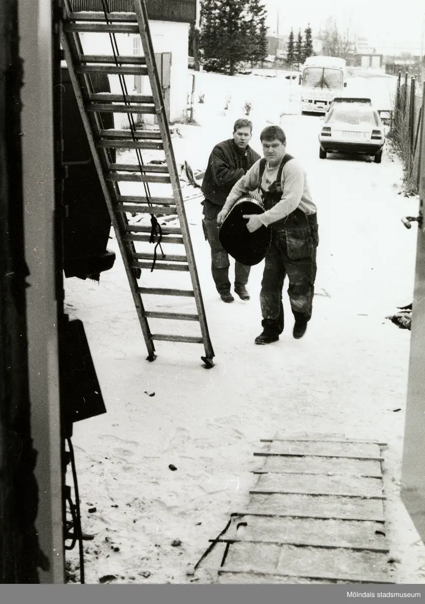Nya Teaterhuset byggs upp 1997 - 1998. Två personer bär på något som liknar en stor svart ihoprullad plastmatta. Framför dem är en stege lutad. Bakom personerna står en bil parkerad som man ser bakifrån samt en lastbil parkerad som man ser framifrån. I bakgrunden är det granar och man skymtar andra byggnader långt bort. På marken ligger det snö.