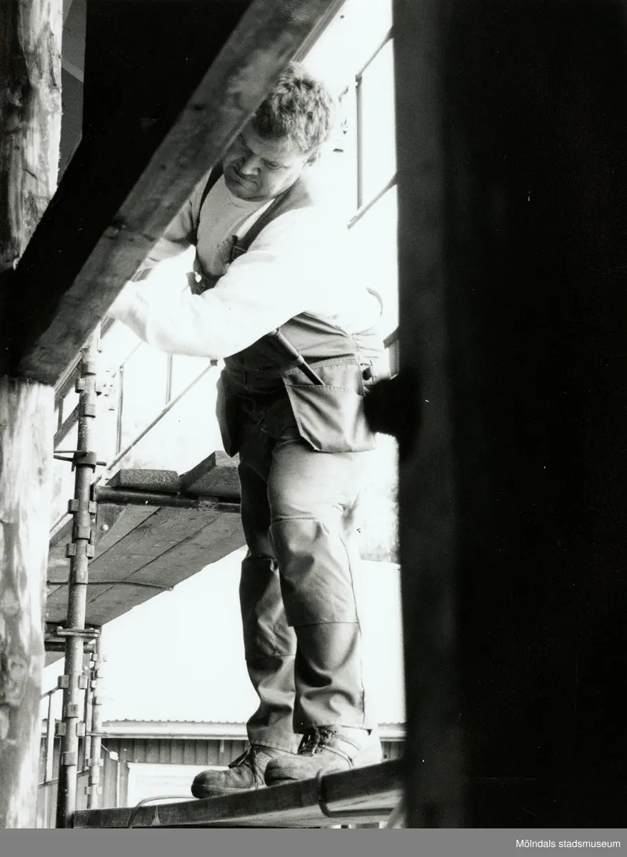 Nya Teaterhuset byggs upp 1997 - 1998. Närbild på en person som är tagen snett framifrån. Personen står på en byggnadsställning utomhus och arbetar med huset. Man ser en bit av byggnadsställningen till vänster. Personen är inramad av bjälkar och byggnadsställning.