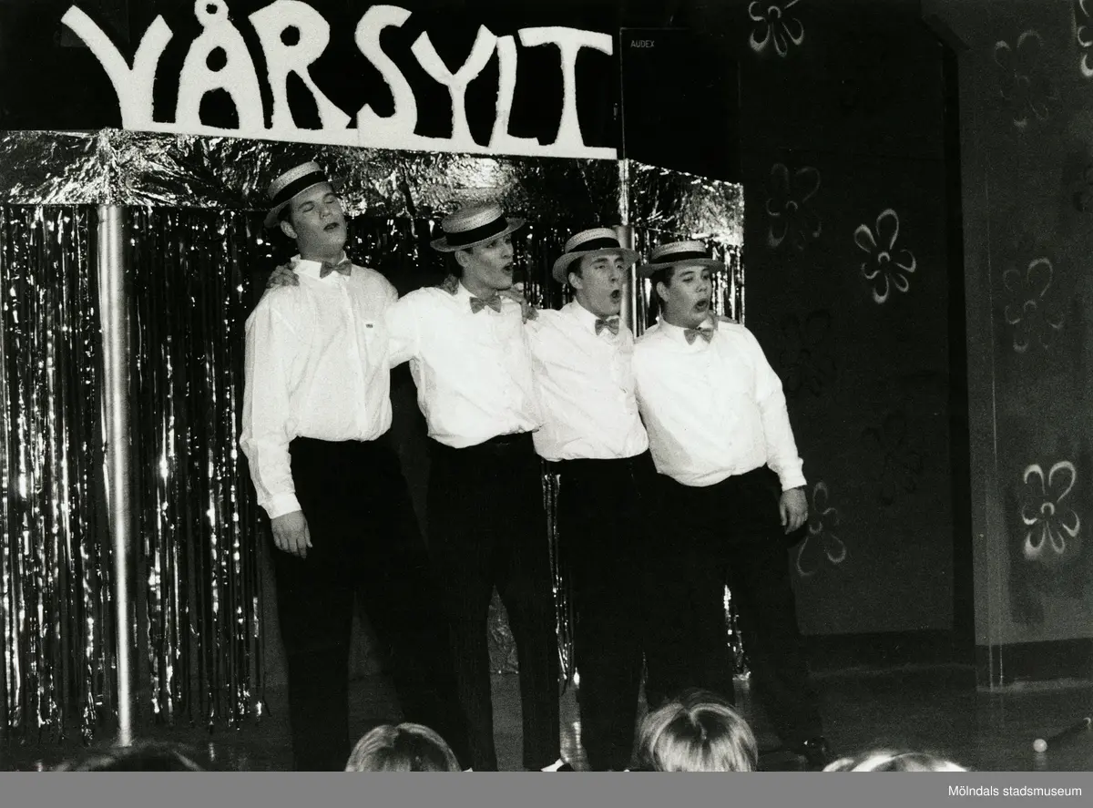 Teaterföreställning i Nya Teaterhuset, okänt årtal. Fyra män uppträder på scenen. De är sminkade, klädda i hatt, vit skjorta, fluga samt svarta byxor och utför någon typ av dans där de håller varandra om axlarna. Tredje person från vänster är Per Andersson. I bakgrunden ses en skylt med "Vårsylt".
