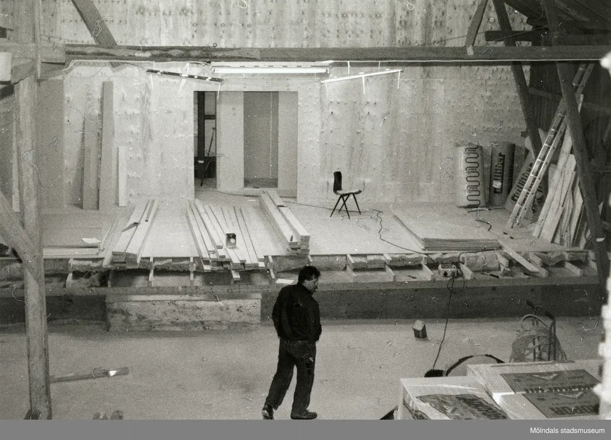 Nya Teaterhuset byggs upp 1997 - 1998. En bild inomhus på ett stort rum. På golvet står det en person som tittar åt höger, bilden är tagen bakifrån. Framför personen från markhöjd är det en uppbyggnad som det ligger lösa plankor på. På uppbyggnaden står det även en stol, och inplastade förpackningar med isolering och en lång stege står lutad mot väggen. Det är en stor öppning i mitten av väggen in till nästa rum. Man ser ladans bjälkar rama in fotot.