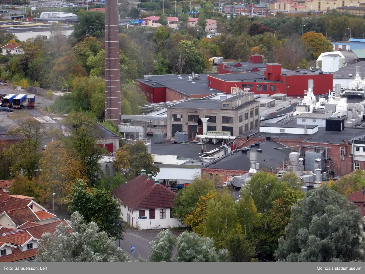Utsikt mot pappersbruket Papyrus från byggnad vid Soabs industrianläggning i Mölndals Kvarnby, år 2007. Anläggningen användes vid fototillfället av Hexion Speciality Chemicals Sweden AB.