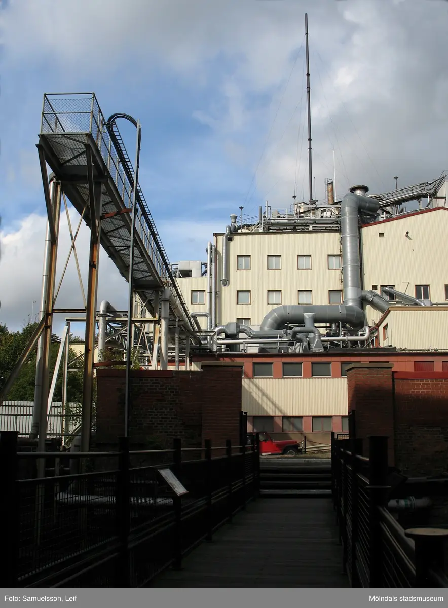 Vy från gångbron vid Stora Götafors, över Mölndalsfallen, mot industribyggnader vid Soabs industrianläggning i Mölndals Kvarnby, år 2007. Anläggningen användes vid fototillfället av Hexion Speciality Chemicals Sweden AB.