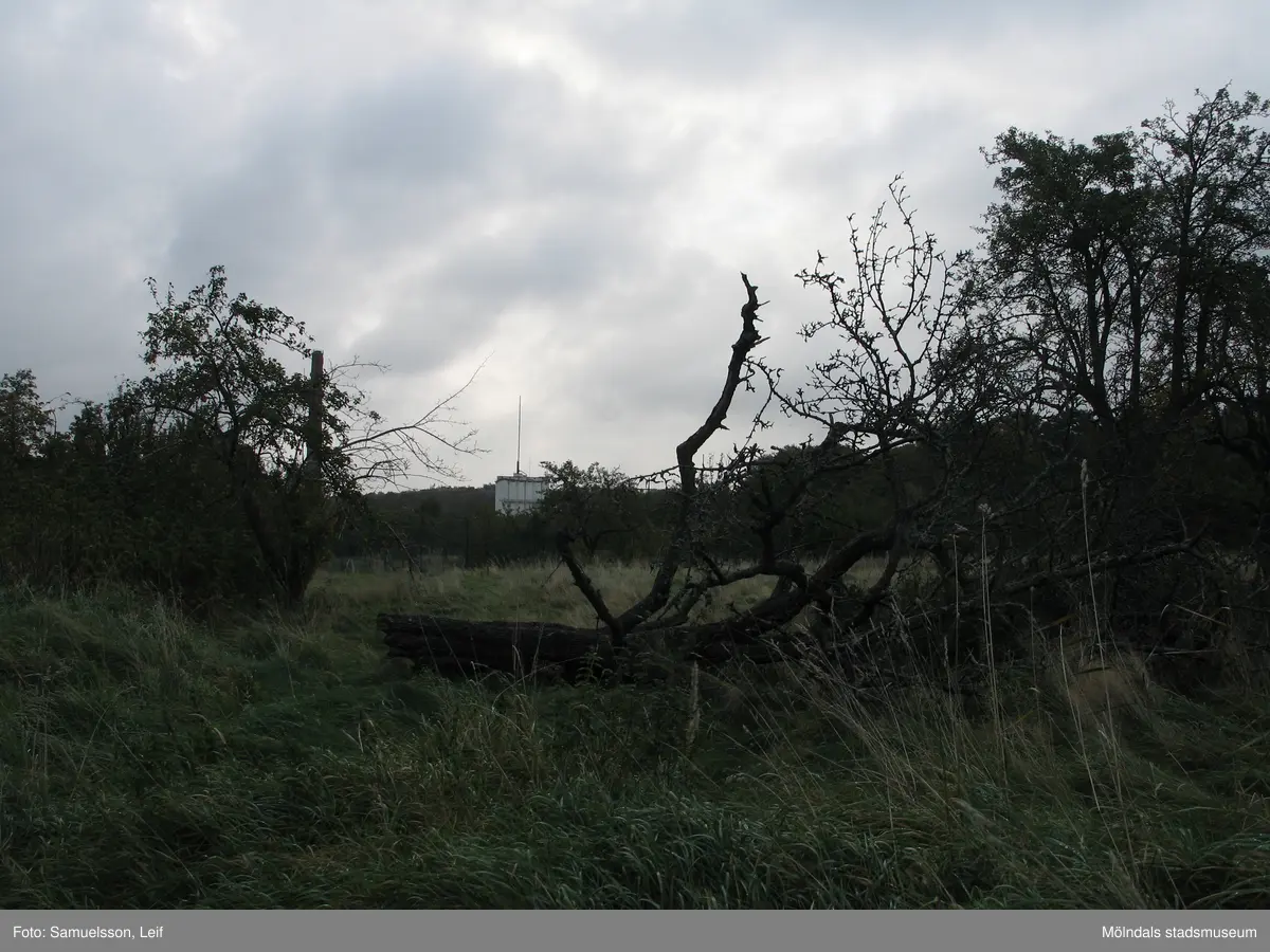 Vy över ett grönområde mot silobyggnaden vid Soabs industrianläggning i Mölndals Kvarnby, år 2007. Anläggningen användes vid fototillfället av Hexion Speciality Chemicals Sweden AB.