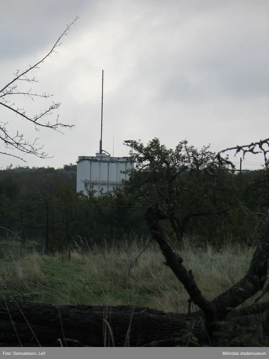 Vy över ett grönområde mot silobyggnaden vid Soabs industrianläggning i Mölndals Kvarnby, år 2007. Anläggningen användes vid fototillfället av Hexion Speciality Chemicals Sweden AB.