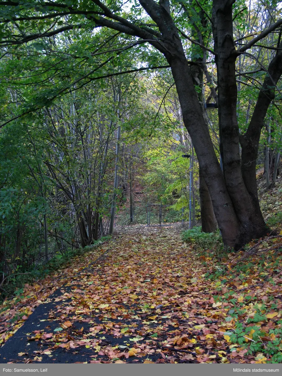 Gångväg som leder mot inhägnat område vid Soabs industrianläggning i Mölndals Kvarnby, år 2007. Anläggningen användes vid fototillfället av Hexion Speciality Chemicals Sweden AB.