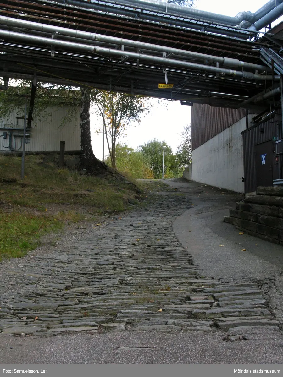 Äldre stenlagd väg som leder upp till byggnader vid Soabs industrianläggning i Mölndals Kvarnby, år 2007. Ovanför vägen ses en mängd rör. Anläggningen användes vid fototillfället av Hexion Speciality Chemicals Sweden AB.