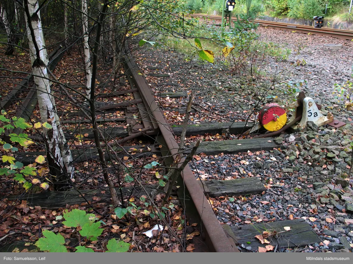 Övervuxet järnvägsspår med växel vid Soabs industrianläggning i Mölndals Kvarnby, år 2007. Anläggningen användes vid fototillfället av Hexion Speciality Chemicals Sweden AB.
