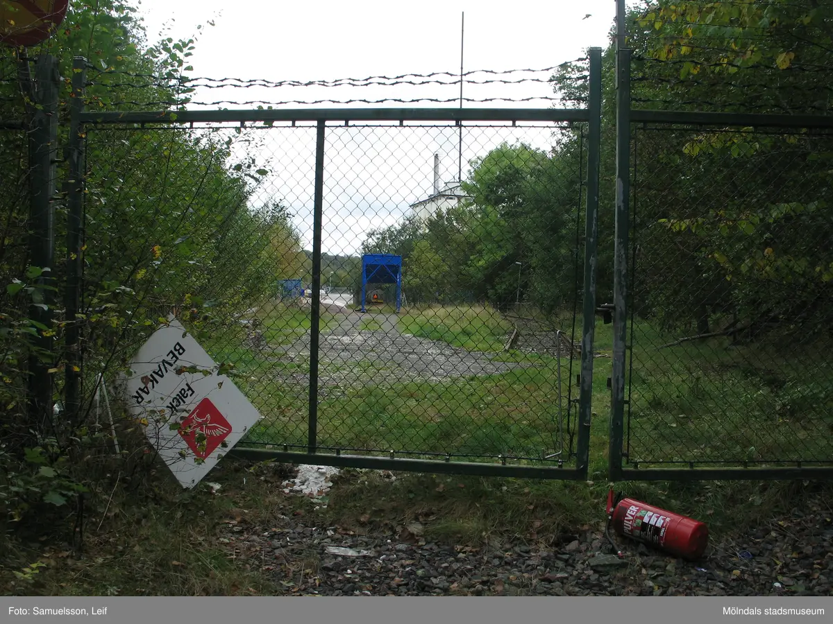 En låst grind in till Soabs industrianläggning i Mölndals Kvarnby, år 2007. På marken ligger en pulversläckare och en skylt. Bakom växtligheten skymtas silobyggnaden. Anläggningen användes vid fototillfället av Hexion Speciality Chemicals Sweden AB.