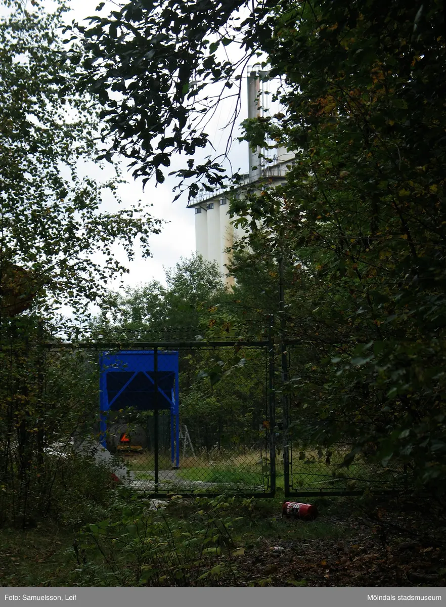 En låst grind in till Soabs industrianläggning i Mölndals Kvarnby, år 2007. På marken ligger en pulversläckare och en skylt. Bakom växtligheten skymtas silobyggnaden. Anläggningen användes vid fototillfället av Hexion Speciality Chemicals Sweden AB.