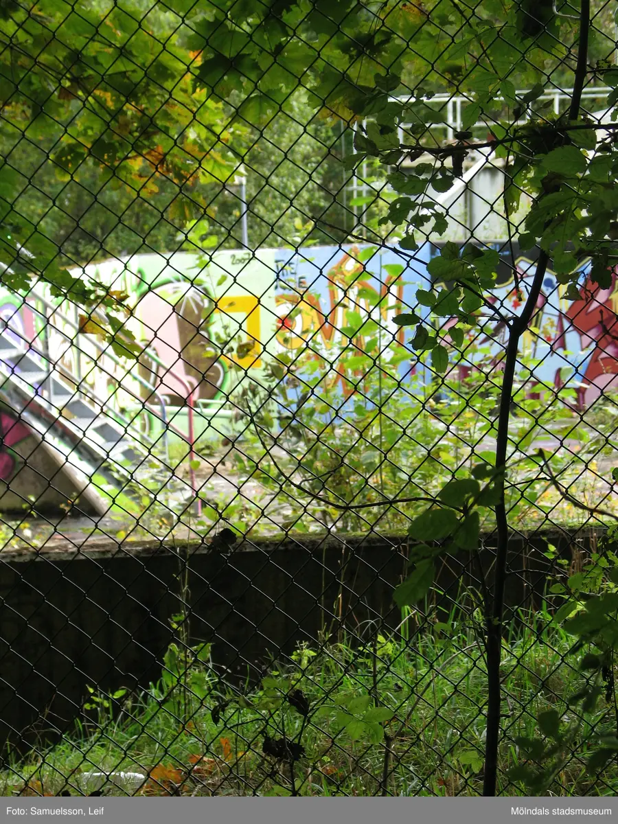 Vy genom ett stängsel mot en betongkonstruktion, invändigt täckt med graffiti, vid Soabs industrianläggning i Mölndals Kvarnby, år 2007. Anläggningen användes vid fototillfället av Hexion Speciality Chemicals Sweden AB.