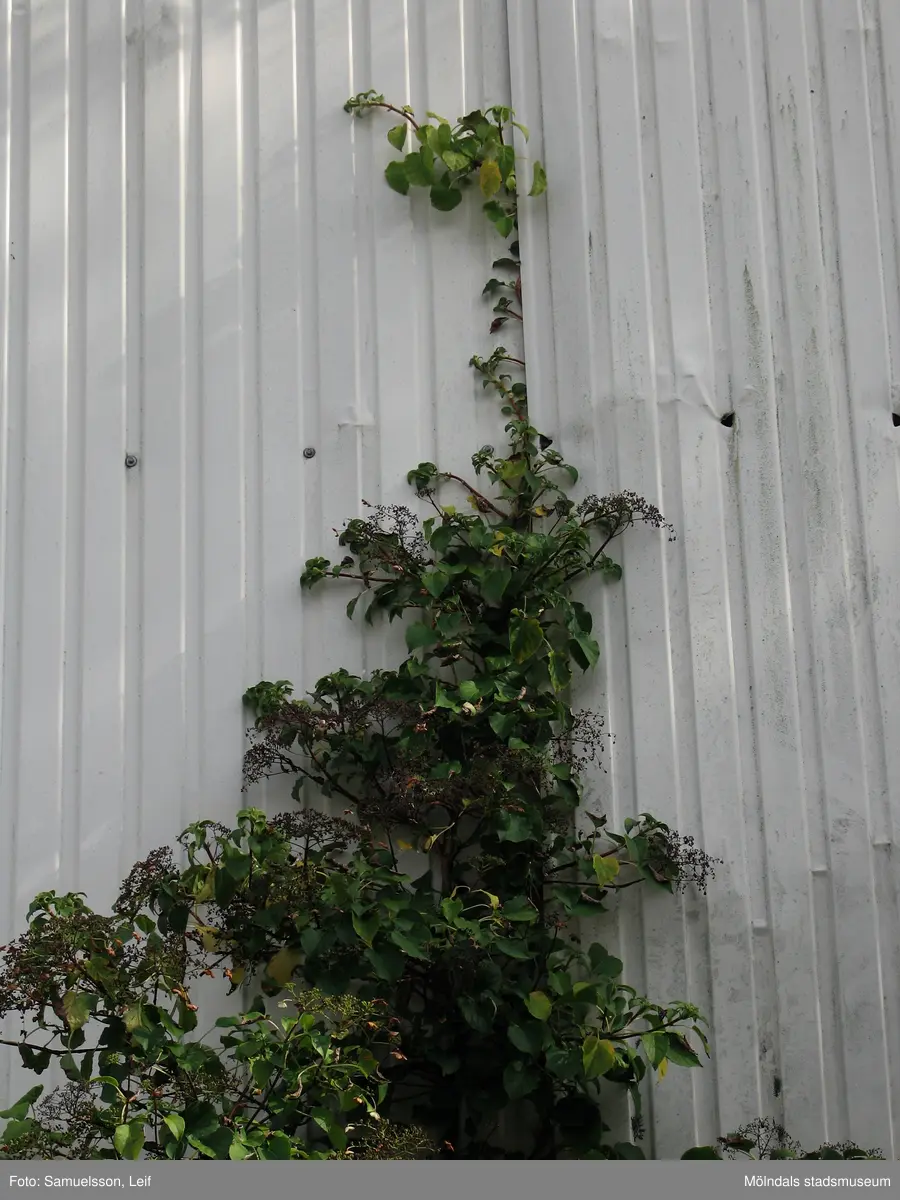 En växt med gröna blad framför en vit vägg. Soabs industrianläggning i Mölndals Kvarnby, år 2007. Anläggningen användes vid fototillfället av Hexion Speciality Chemicals Sweden AB.