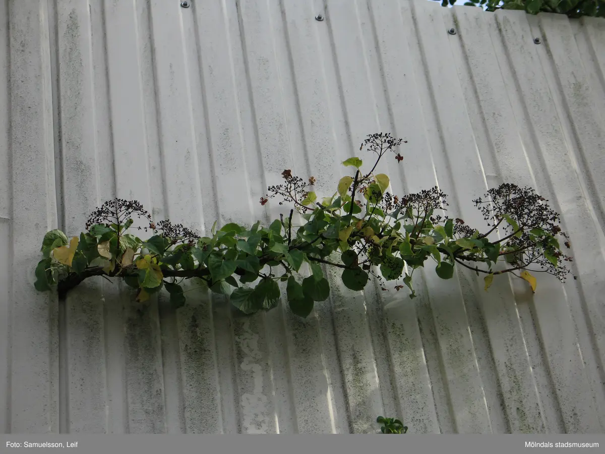 En växt med gröna blad framför en vit vägg. Soabs industrianläggning i Mölndals Kvarnby, år 2007. Anläggningen användes vid fototillfället av Hexion Speciality Chemicals Sweden AB.