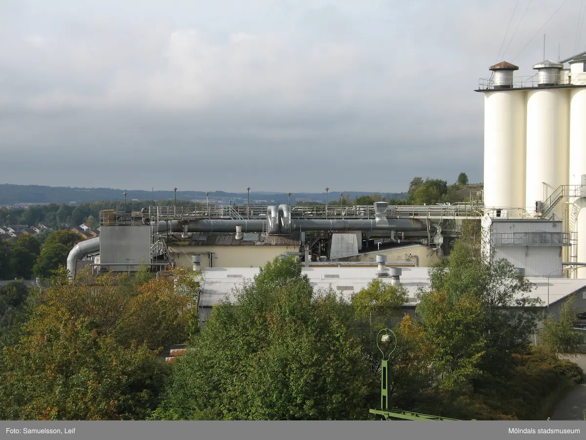 Vy över järnvägen mot Soabs fabriksbyggnader i Mölndals Kvarnby, år 2007. Anläggningen användes vid fototillfället av Hexion Speciality Chemicals Sweden AB.