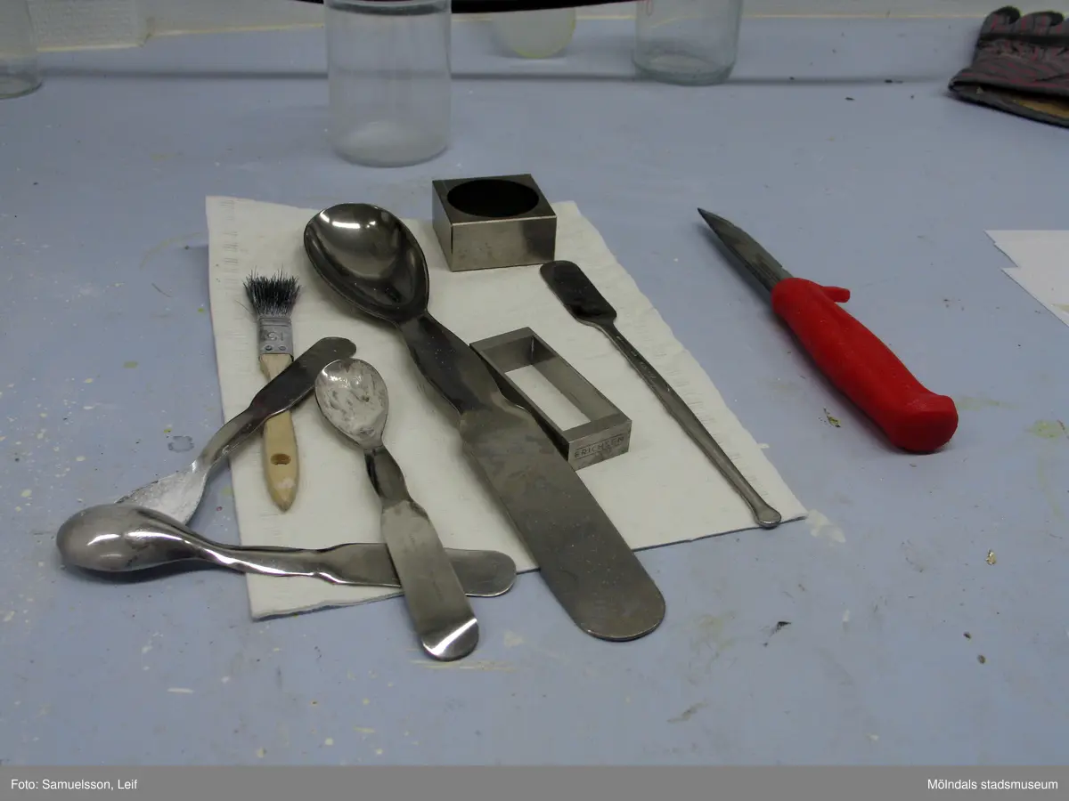 En samling redskap på ett bord. Bland annat några skedar, en pensel samt en kniv. Interiörfotografi från byggnad vid Soabs industrianläggning i Mölndals Kvarnby, år 2007. Anläggningen användes vid fototillfället av Hexion Speciality Chemicals Sweden AB.