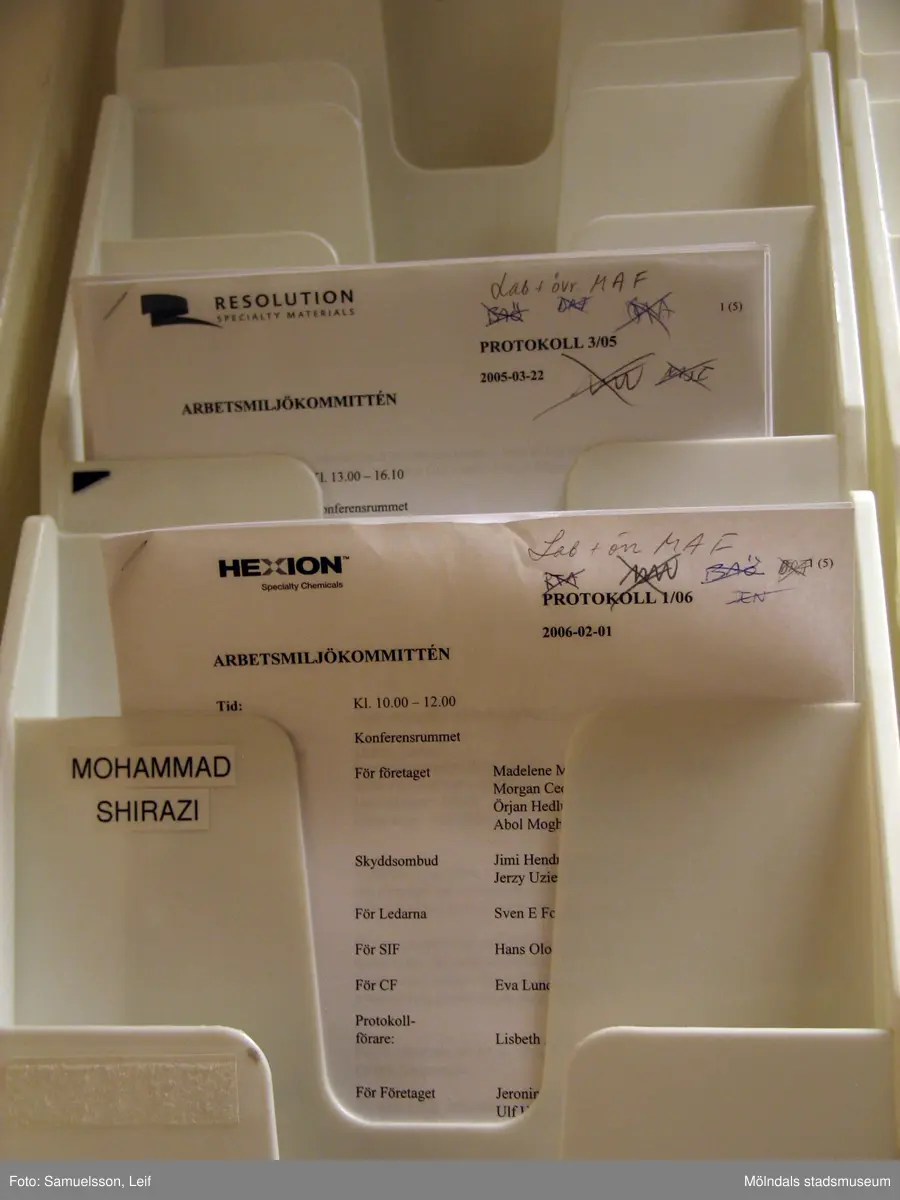 Dokumentfack med protokoll. Interiörfotografi från byggnad vid Soabs industrianläggning i Mölndals Kvarnby, år 2007. Anläggningen användes vid fototillfället av Hexion Speciality Chemicals Sweden AB.