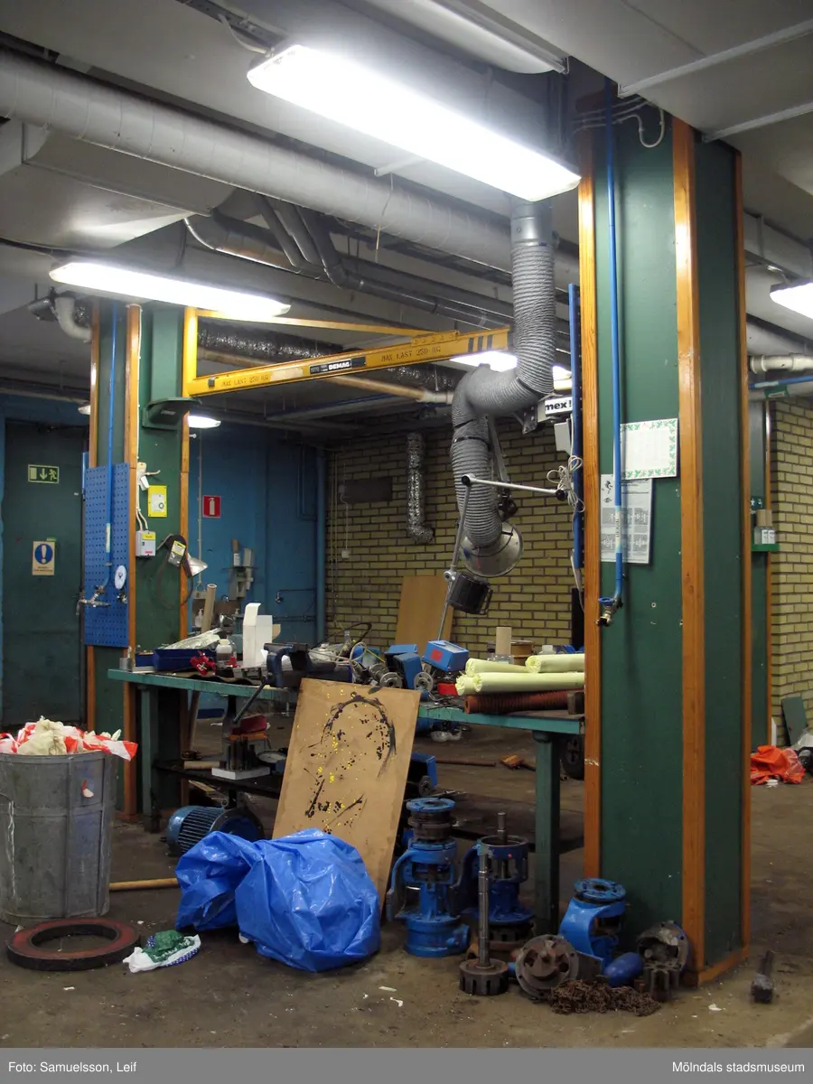 Verkstadsmiljö. En bänk med ett flertal föremål. Även på golvet står saker. Interiörfotografi från byggnad vid Soabs industrianläggning i Mölndals Kvarnby, år 2007. Anläggningen användes vid fototillfället av Hexion Speciality Chemicals Sweden AB.
