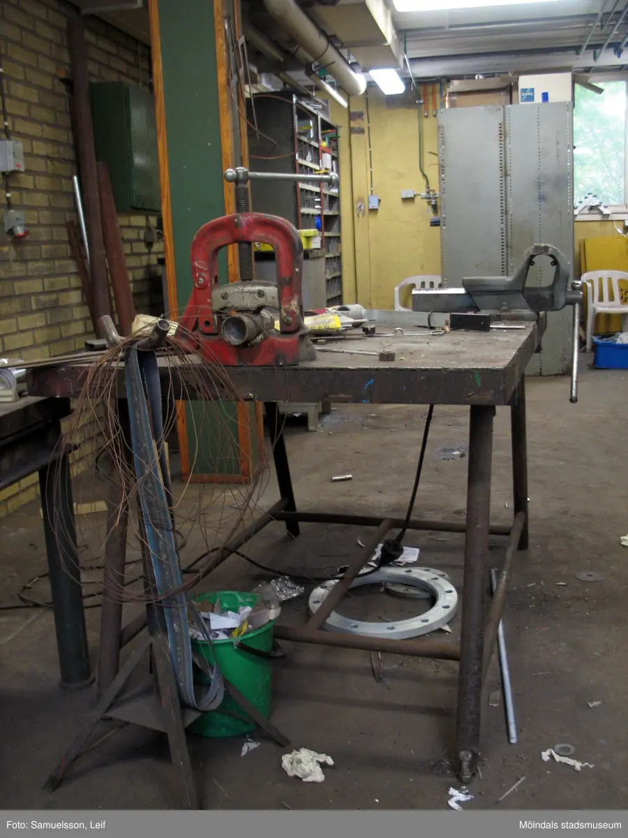 Verkstadsmiljö. En bänk med verktyg. Interiörfotografi från byggnad vid Soabs industrianläggning i Mölndals Kvarnby, år 2007. Anläggningen användes vid fototillfället av Hexion Speciality Chemicals Sweden AB.
