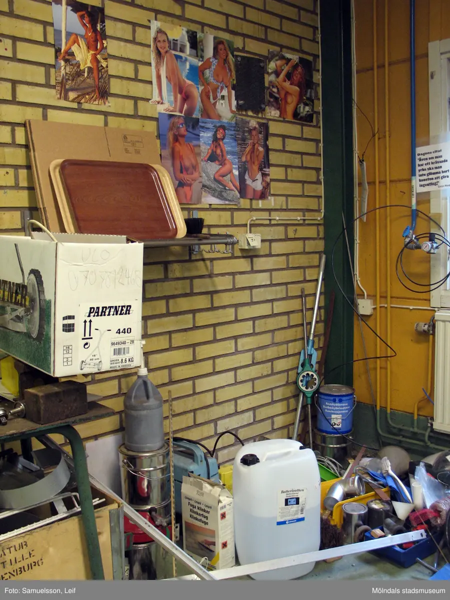 Gul tegelvägg med uppsatta bilder på lättklädda damer. På golvet nedanför står ett flertal föremål. Interiörfotografi från byggnad vid Soabs industrianläggning i Mölndals Kvarnby, år 2007. Anläggningen användes vid fototillfället av Hexion Speciality Chemicals Sweden AB.