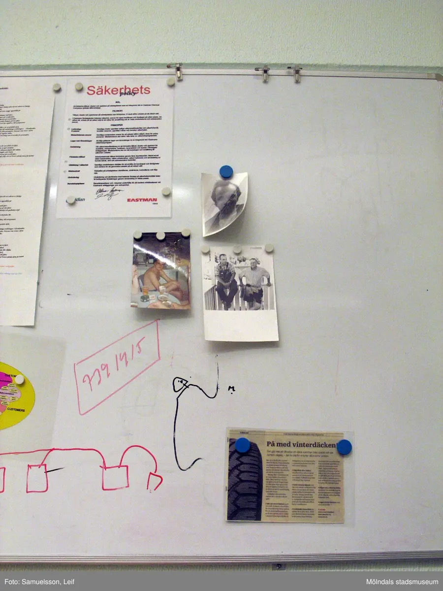 En whiteboardtavla med uppsatta dokument och fotografier. Interiörfotografi från byggnad vid Soabs industrianläggning i Mölndals Kvarnby, år 2007. Anläggningen användes vid fototillfället av Hexion Speciality Chemicals Sweden AB.