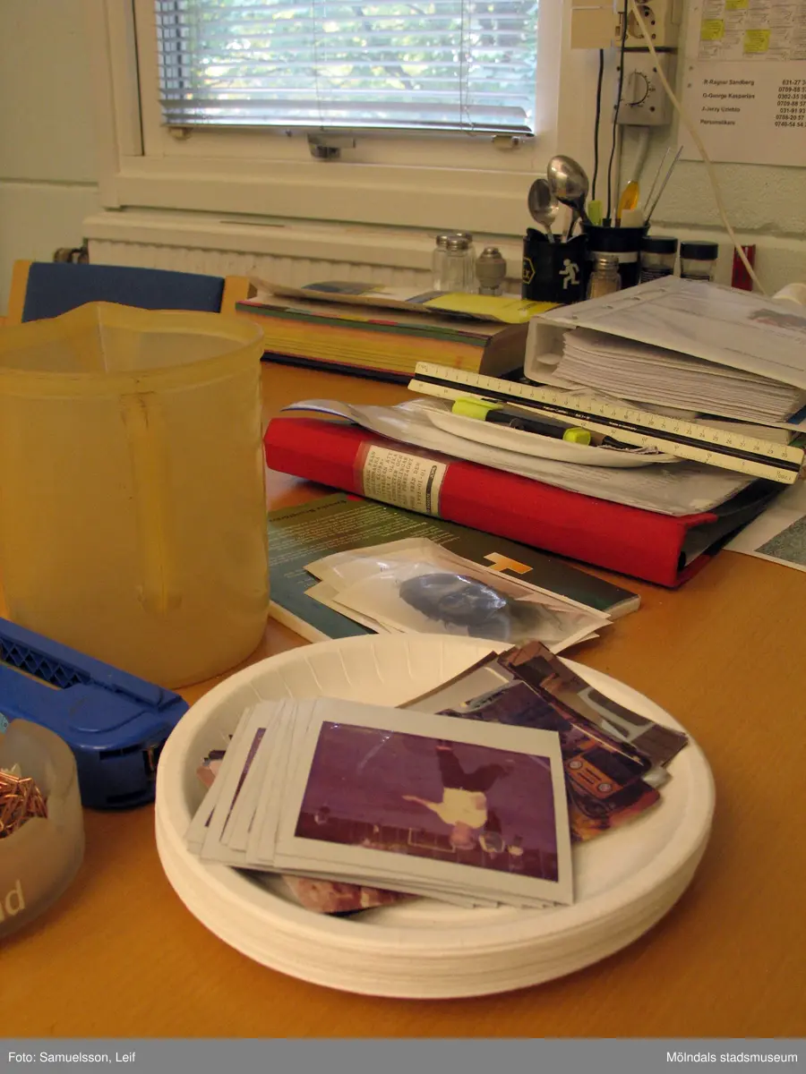 Ett flertal föremål som ligger på ett bord. Interiörfotografi från byggnad vid Soabs industrianläggning i Mölndals Kvarnby, år 2007. Anläggningen användes vid fototillfället av Hexion Speciality Chemicals Sweden AB.