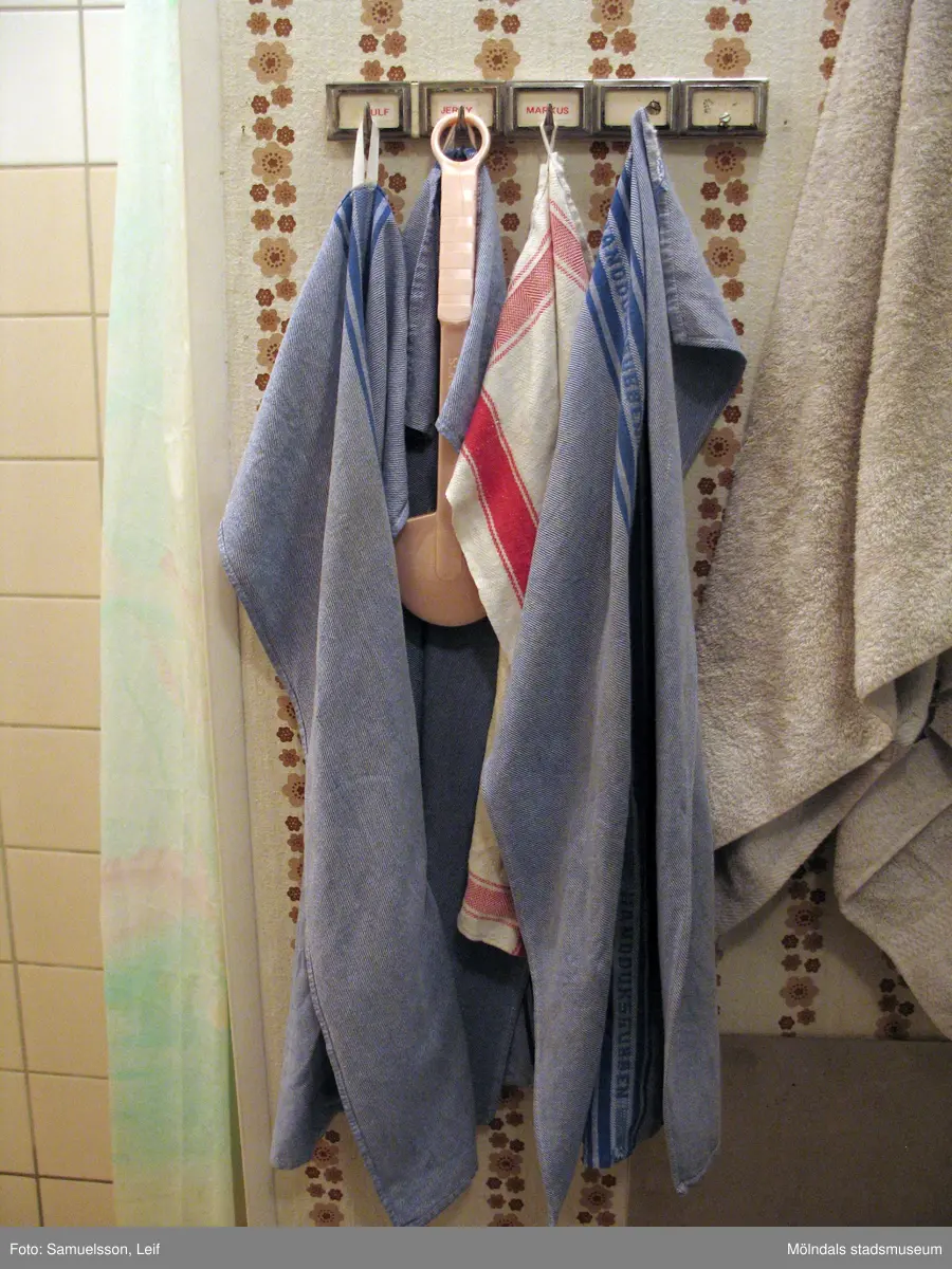 Duschutrymme. På väggen sitter krokar med upphängda handdukar. Interiörfotografi från byggnad vid Soabs industrianläggning i Mölndals Kvarnby, år 2007. Anläggningen användes vid fototillfället av Hexion Speciality Chemicals Sweden AB.