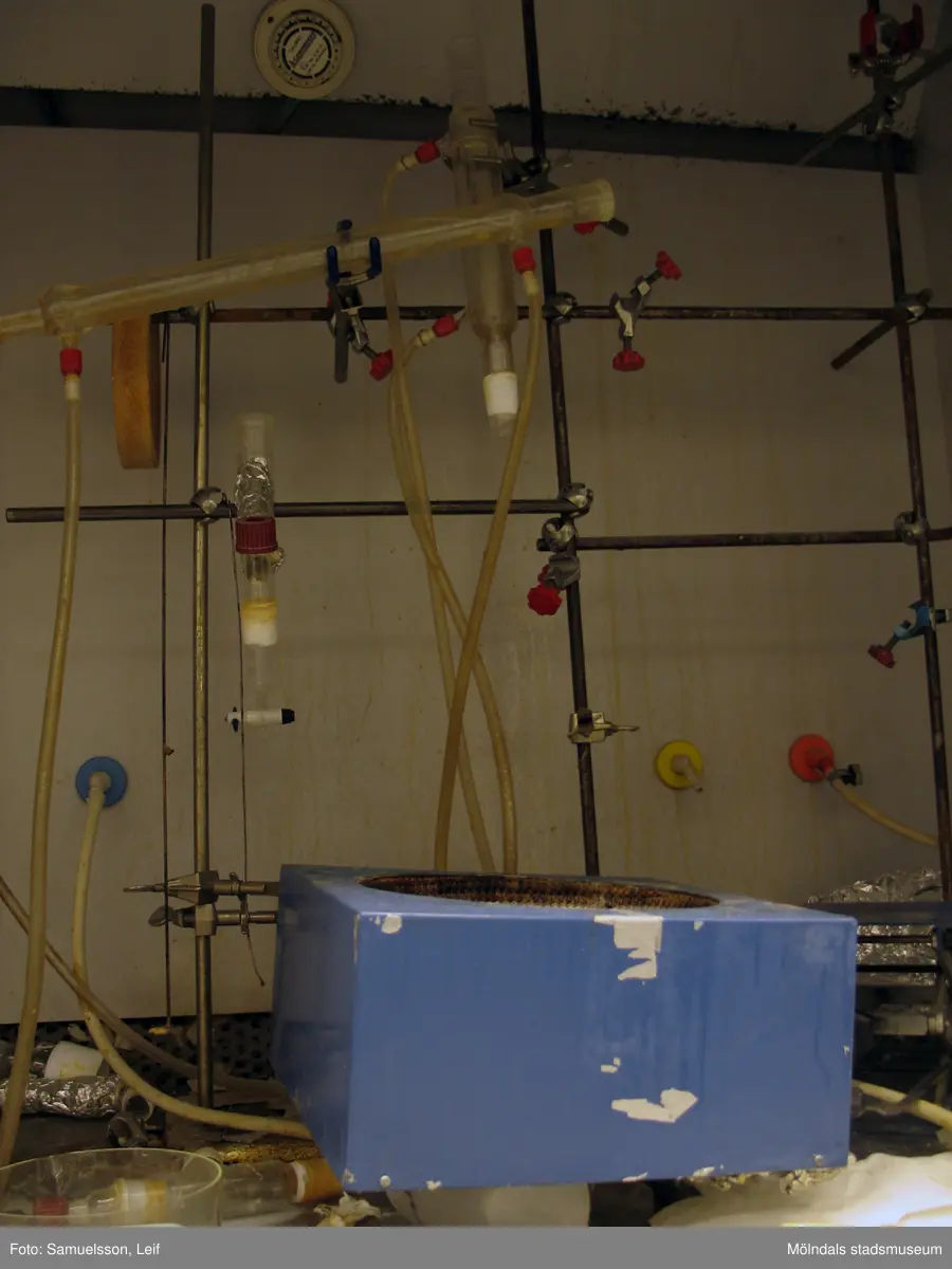 Laboratorieutrustning. Flera ihopkopplade plastslangar. Interiörfotografi från byggnad vid Soabs industrianläggning i Mölndals Kvarnby, år 2007. Anläggningen användes vid fototillfället av Hexion Speciality Chemicals Sweden AB.