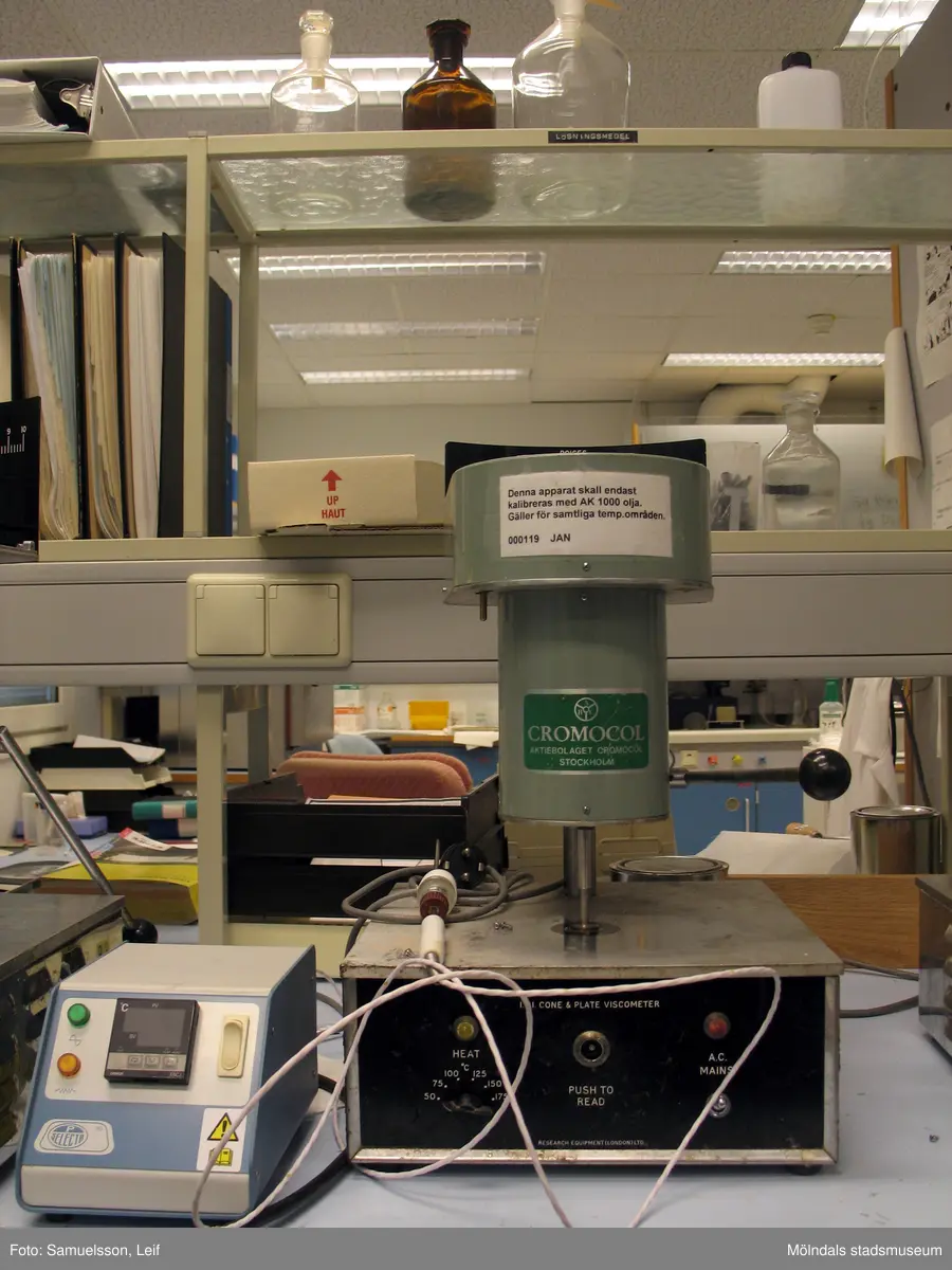 Laboratoriemiljö. Mätinstrument på en bänk. Interiörfotografi från byggnad vid Soabs industrianläggning i Mölndals Kvarnby, år 2007. Anläggningen användes vid fototillfället av Hexion Speciality Chemicals Sweden AB.