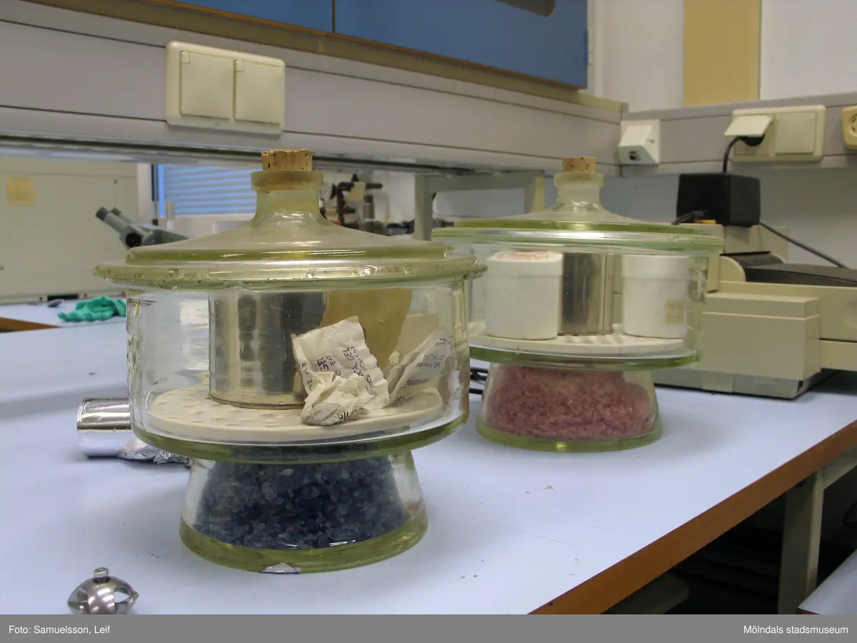 Laboratoriemiljö. Två glasbehållare på en bänk. Interiörfotografi från byggnad vid Soabs industrianläggning i Mölndals Kvarnby, år 2007. Anläggningen användes vid fototillfället av Hexion Speciality Chemicals Sweden AB.