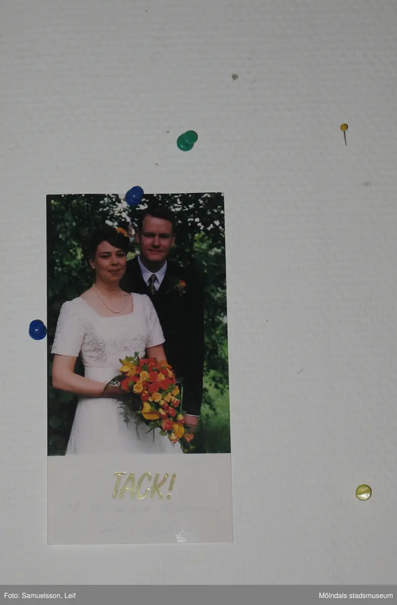 Ett bröllopsfotografi uppsatt på en vägg. Interiörfotografi från byggnad vid Soabs industrianläggning i Mölndals Kvarnby, år 2007. Anläggningen användes vid fototillfället av Hexion Speciality Chemicals Sweden AB.