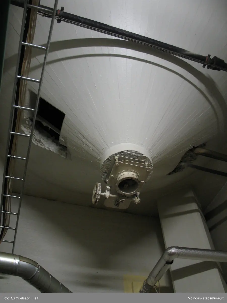 Utrymme med ett utlopp i taket. Interiörfotografi från byggnad vid Soabs industrianläggning i Mölndals Kvarnby, år 2007. Anläggningen användes vid fototillfället av Hexion Speciality Chemicals Sweden AB.