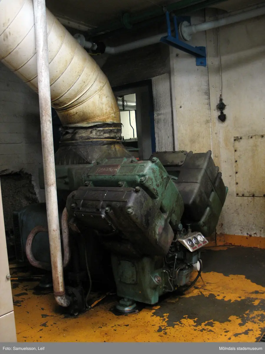 Utrymme med en gammal maskin. Interiörfotografi från byggnad vid Soabs industrianläggning i Mölndals Kvarnby, år 2007. Anläggningen användes vid fototillfället av Hexion Speciality Chemicals Sweden AB.