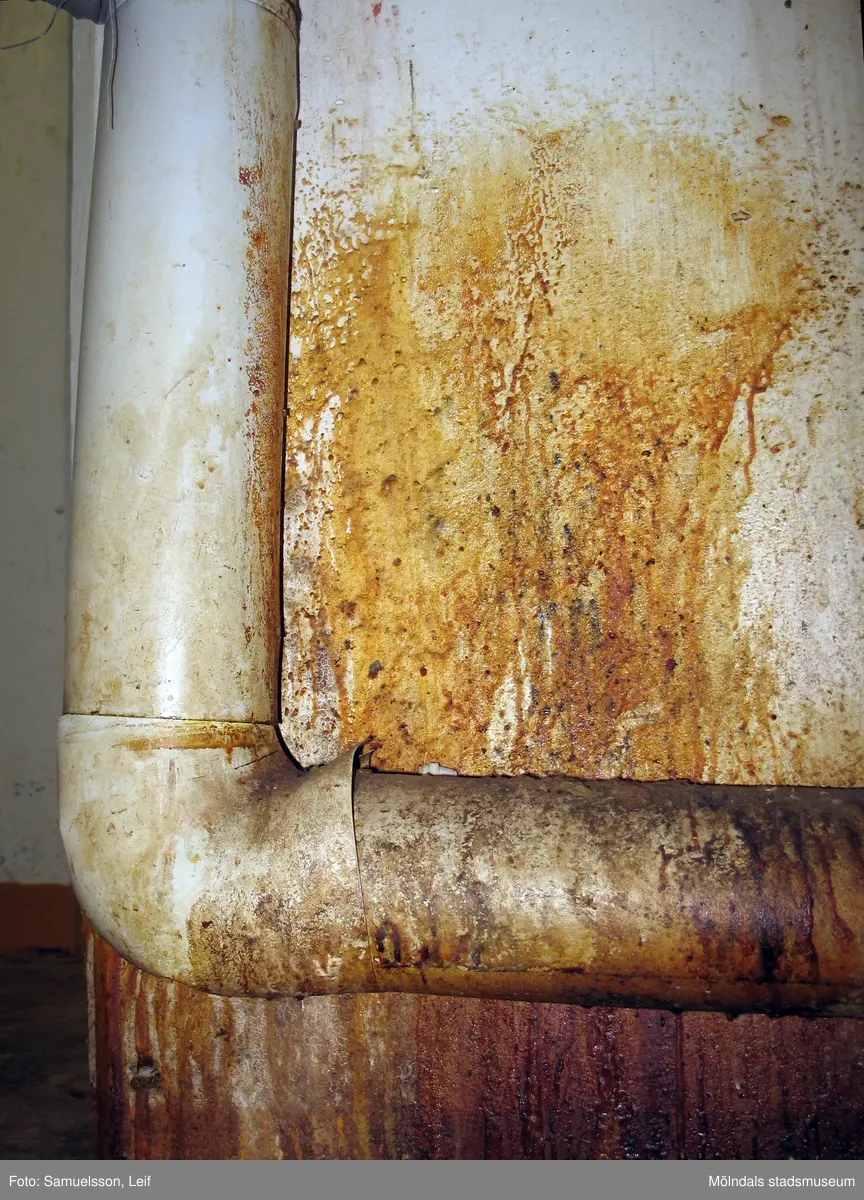 Gammalt rör intill en vägg. Interiörfotografi från byggnad vid Soabs industrianläggning i Mölndals Kvarnby, år 2007. Anläggningen användes vid fototillfället av Hexion Speciality Chemicals Sweden AB.