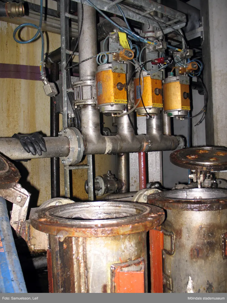 Rörledningar, slangar och behållare. Interiörfotografi från byggnad vid Soabs industrianläggning i Mölndals Kvarnby, år 2007. Anläggningen användes vid fototillfället av Hexion Speciality Chemicals Sweden AB.