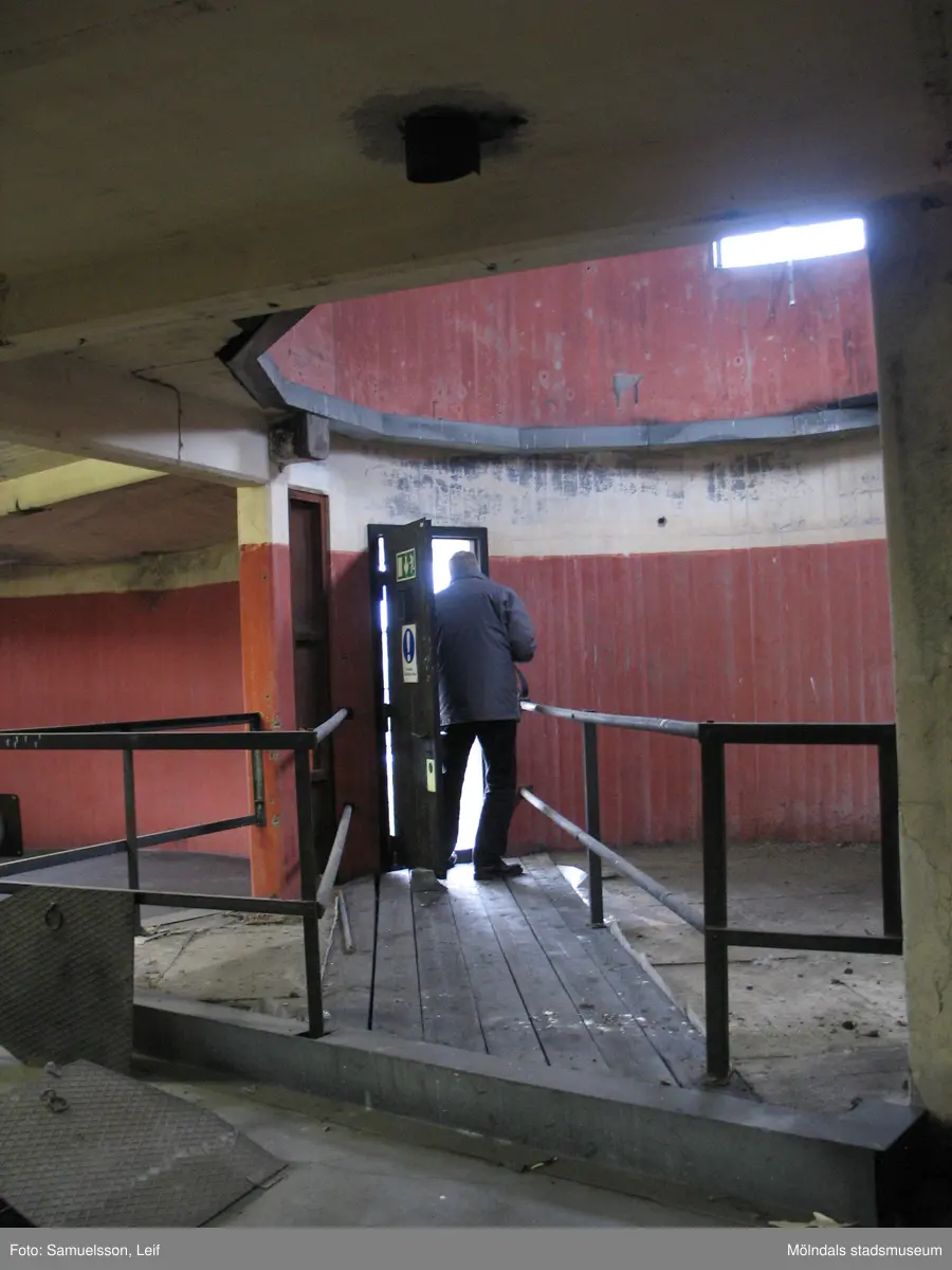 En man på väg ut genom en dörr. Interiörfotografi från byggnad vid Soabs industrianläggning i Mölndals Kvarnby, år 2007. Anläggningen användes vid fototillfället av Hexion Speciality Chemicals Sweden AB.