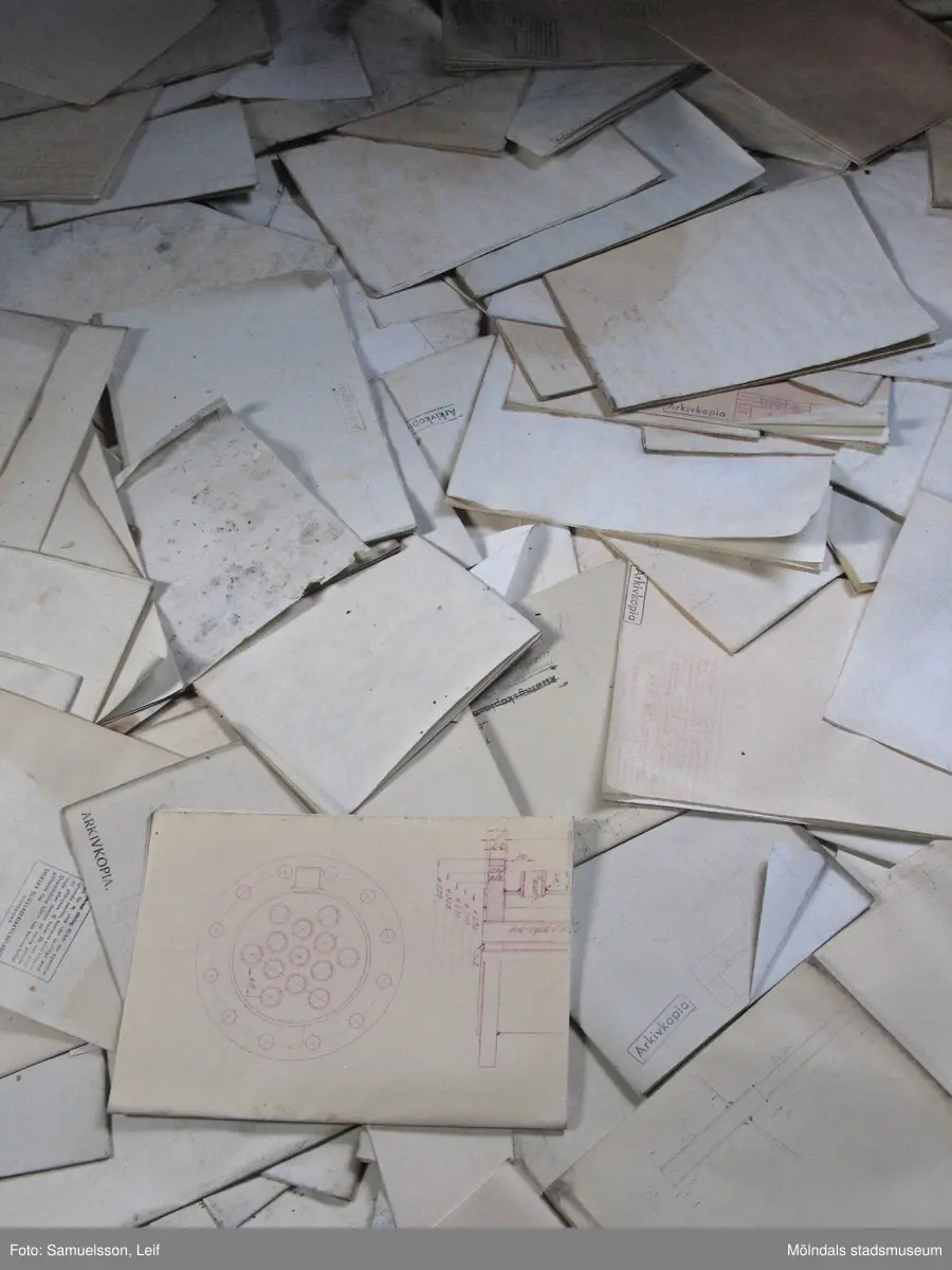 Arkivmateral ligger utspritt på golvet i byggnad vid Soabs industrianläggning i Mölndals Kvarnby, år 2007. Anläggningen användes vid fototillfället av Hexion Speciality Chemicals Sweden AB.