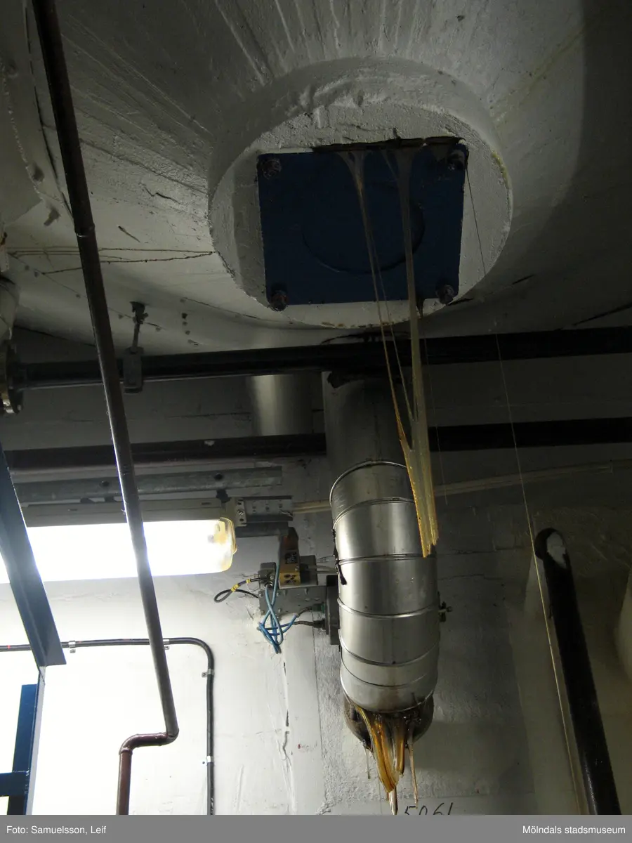 Utrymme med ett utlopp i taket. Interiörfotografi från byggnad vid Soabs industrianläggning i Mölndals Kvarnby, år 2007. Anläggningen användes vid fototillfället av Hexion Speciality Chemicals Sweden AB.