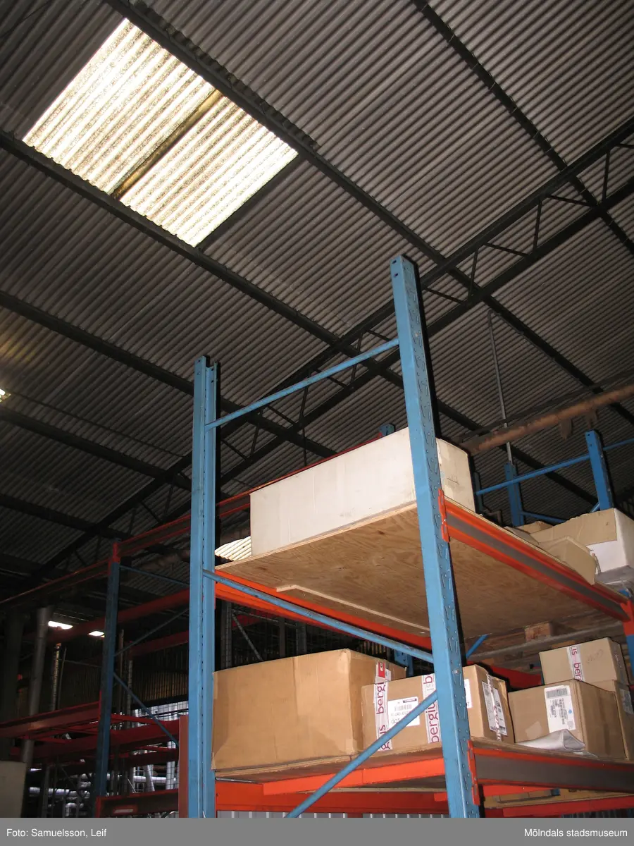 Pallställ i en lagerlokal. Interiörfotografi från Soabs industrianläggning i Mölndals Kvarnby, år 2007. Anläggningen användes vid fototillfället av Hexion Speciality Chemicals Sweden AB.