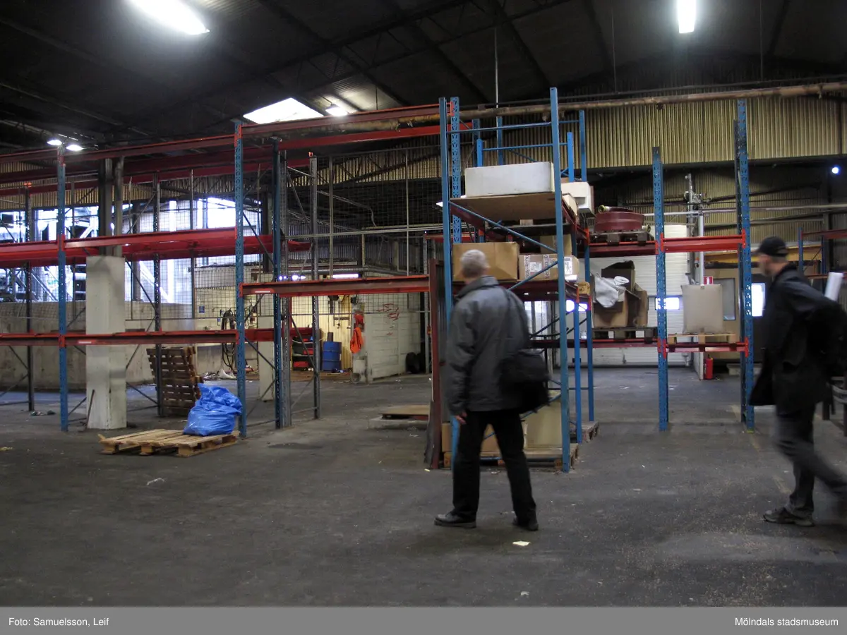 Lagerlokal med pallställ. Två män går förbi. Interiörfotografi från Soabs industrianläggning i Mölndals Kvarnby, år 2007. Anläggningen användes vid fototillfället av Hexion Speciality Chemicals Sweden AB.