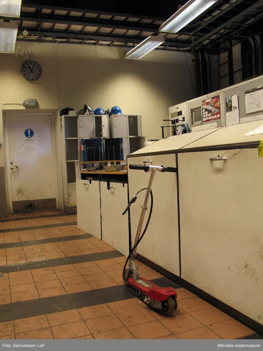 Kontrollrum i vilket det står en elsparkcykel parkerad. Interiörfotografi från byggnad vid Soabs industrianläggning i Mölndals Kvarnby, år 2007. Anläggningen användes vid fototillfället av Hexion Speciality Chemicals Sweden AB.